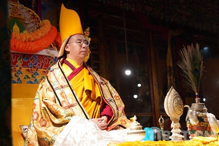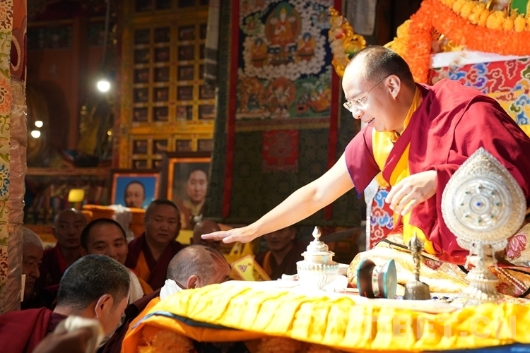 隨后,班禪在瓊布·阿旺強巴堅贊活佛引領下,緩緩進入寺廟主殿。在主殿內(nèi),班禪每到一座佛像前都雙手合十為眾生祈禱,并向佛像敬獻哈達,祈求國泰民安、利樂眾生。此時,僧眾也齊聲誦經(jīng)、虔誠祝禱。禮佛后,班禪登上主殿寶座,向寺廟僧眾傳授《三主要道論》《圣道啟門頌》《兜率百尊上師瑜伽》,并為僧眾摸頂賜福。