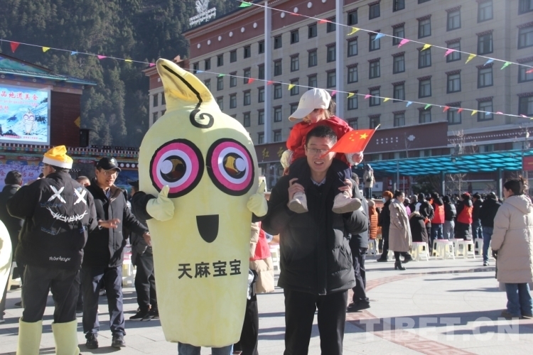 圖為開(kāi)幕式現(xiàn)場(chǎng)觀眾與天麻寶寶合影 攝影:旦曲