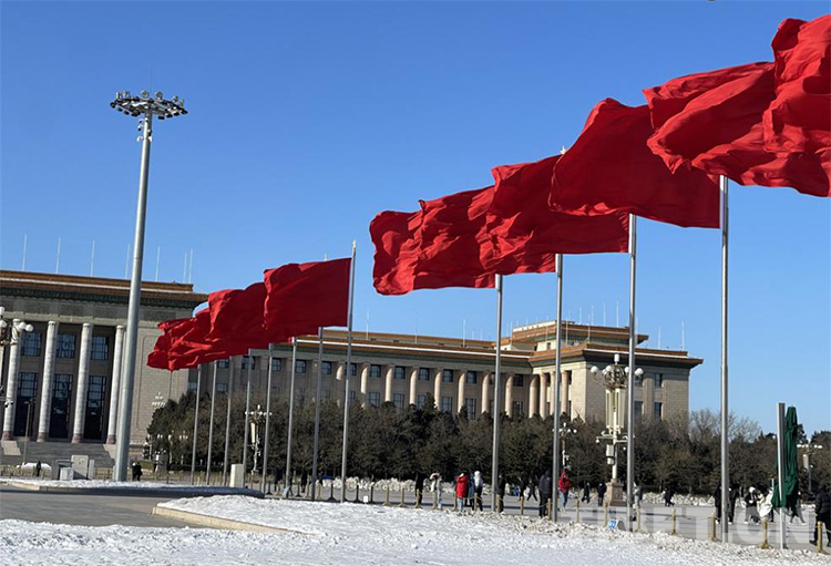 圖為天安門廣場(chǎng)上迎風(fēng)飄揚(yáng)的紅旗 攝影:王妍丹
