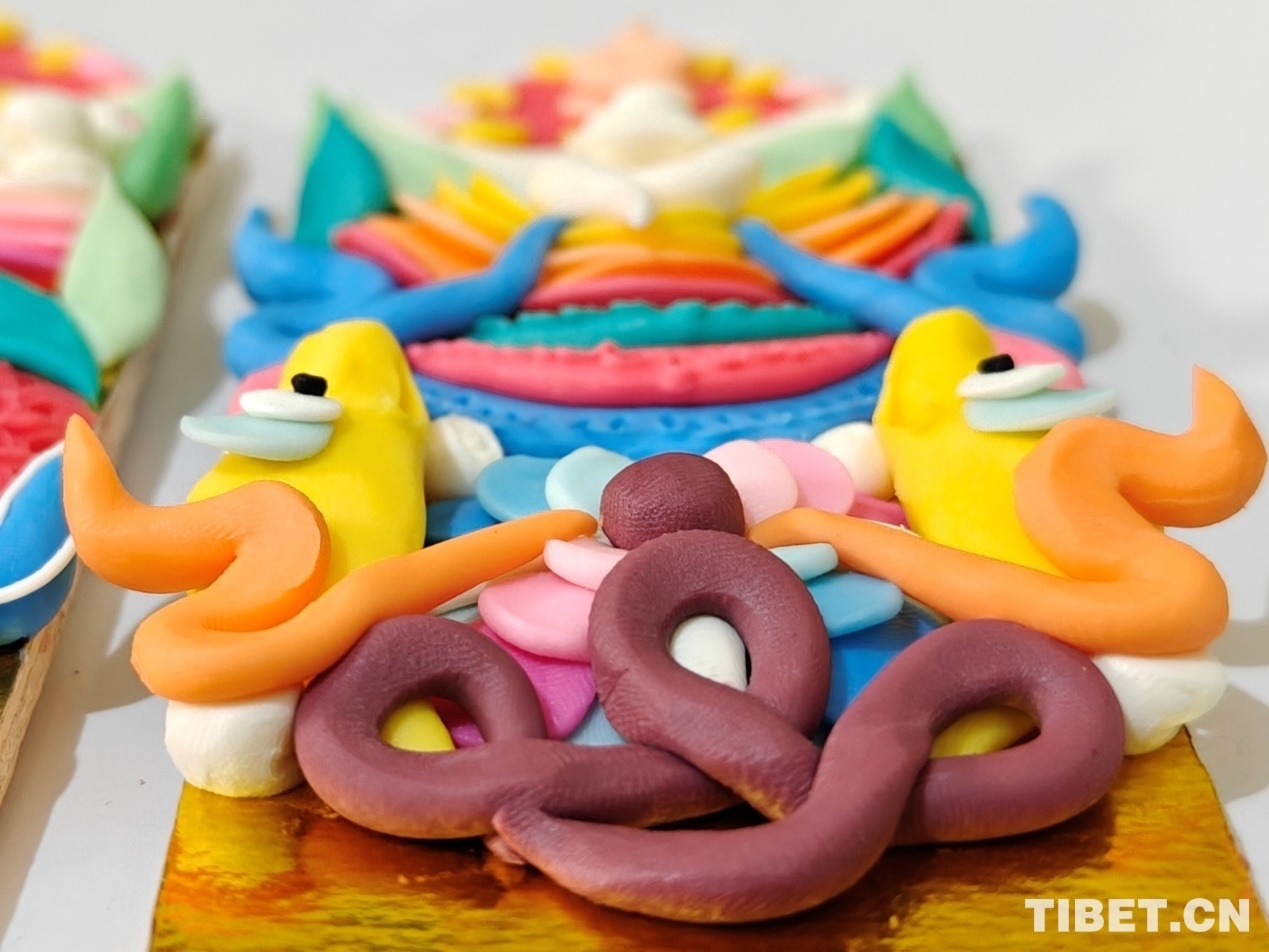 頓珠的二兒子丹增朗杰今年只有19歲,是一名高中生,但制作酥油花的手法已經(jīng)極為嫻熟。他盤腿而坐,面前擺放著調(diào)制好的各色酥油和一盆清水。只見(jiàn)他捏取一小塊酥油在冷水中浸泡一會(huì),然后熟練地用食指和拇指將酥油捏成不同形狀,粘貼于一塊盾形木板上,一對(duì)對(duì)色彩斑斕、寓意吉祥的酥油花作品便完成了。