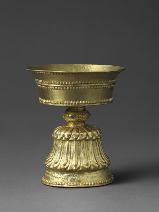 圖為公元18世紀(jì)銀質(zhì)嵌松石瓔珞紋尊勝瓶