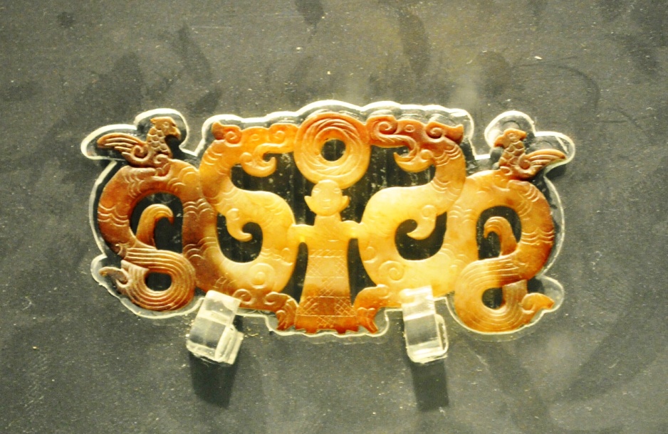 圖為湖北荊州出土楚國玉佩:二龍拱璧,載人升天,攝于荊州博物館,距今2400年