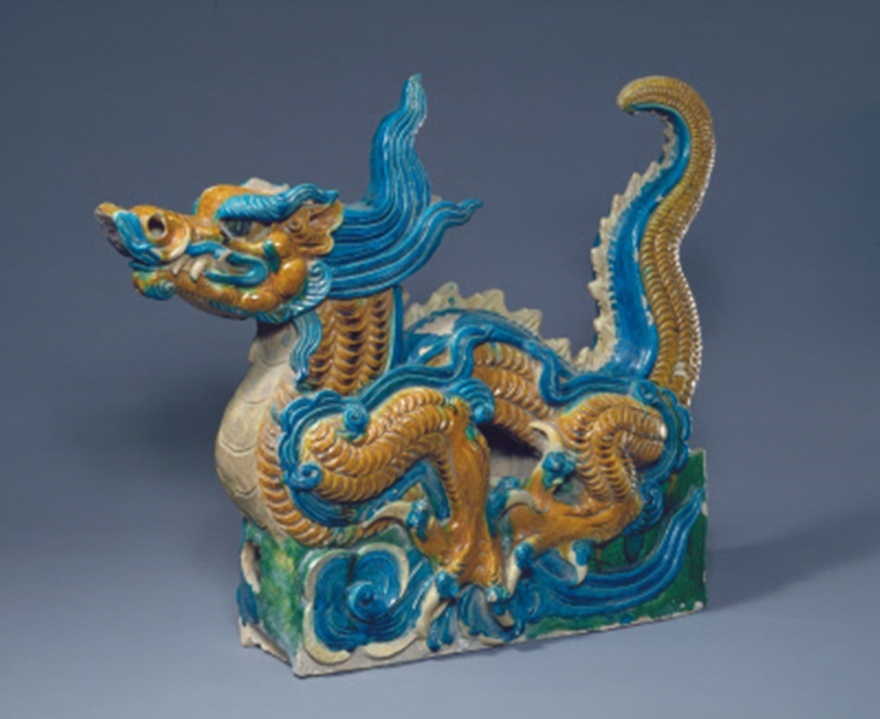 明代的三彩琉璃龍形建筑構(gòu)件,高64 厘米,長76 厘米。此建筑構(gòu)件應(yīng)是安置在宮殿垂脊前面的垂獸。垂獸,也有人稱為“角獸”,指的是中國古建筑屋頂垂脊或角脊端部的獸形構(gòu)件,多用在廡殿頂、硬山頂與歇山頂上,起固定瓦片的作用。