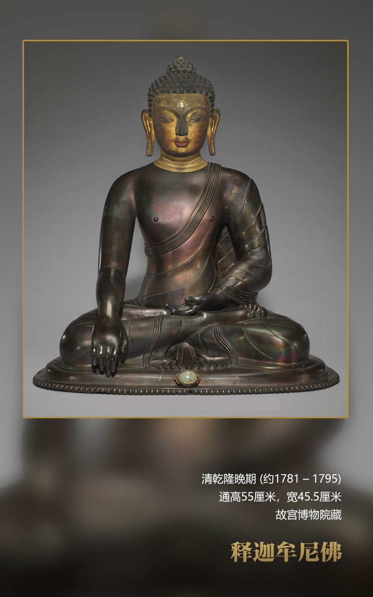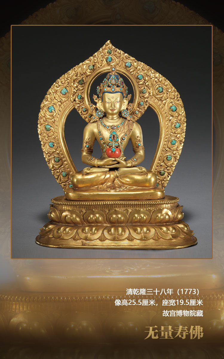 這尊造像與其他五十五尊同樣造型的無量壽佛,一同供奉在紫禁城養(yǎng)性殿西暖閣佛堂的一座八面七層的紫檀木佛塔中。根據(jù)《六世班禪洛桑巴丹益希傳》、內(nèi)務(wù)府造辦處《活計(jì)檔》及軍機(jī)處滿文檔案的記載,乾隆帝在乾隆三十五年(1770)寧壽宮區(qū)域營建開始前,即乾隆三十三年(1768)向六世班禪訂做了這五十六尊無量壽佛,佛像圖樣、鑲嵌寶石等材料均為宮廷提供。這些造像于乾隆三十八年完成并送回宮廷,此后一直供奉于養(yǎng)性殿佛堂至今。乾隆四十五年(1780)六世班禪進(jìn)京朝覲,還曾親自瞻仰過此塔此像。故這組無量壽佛,是乾隆時(shí)期宮廷審美與扎什倫布寺造像技術(shù)的高度融合,經(jīng)過乾隆帝本人親自設(shè)計(jì),又有明確的制作時(shí)間,是清代宮廷造像及扎什倫布寺造像研究的重要標(biāo)型器物。