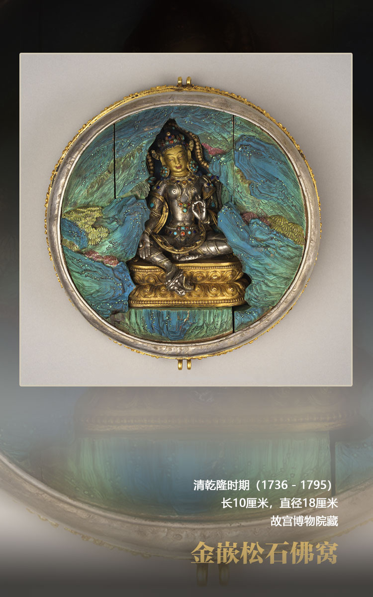 此佛窩九成金質(zhì),圓盒狀,金質(zhì)盒蓋上滿嵌梯形同心圓狀綠松石片,側(cè)面有三條松石鑲嵌的裝飾帶及蓮花紋圖案。盒蓋兩邊有可拆卸雙耳,可穿繩佩戴頸上,為護(hù)身佛盒。盒內(nèi)填染青綠木雕山洞,中間供有銀質(zhì)綠度母一尊。度母面部泥金,右手與愿印,左手說法印,身上嵌綠松石、青金石、蜜蠟等,游戲坐于飾連珠紋和俯仰蓮瓣紋的金座上。附黃紙簽一張,上書漢、滿、蒙、藏四體文題記,漢文曰:“乾隆四十五年八月初七日,班禪額爾德尼恭祝皇上七旬萬壽,遞丹書,呈進(jìn)大利益綠衣救度佛母古佛?!?此處“大利益”有大功德之意,根據(jù)銘文可知,這個(gè)佛窩應(yīng)是乾隆帝七十大壽時(shí)六世班禪敬獻(xiàn)的祝壽禮物。(文圖資料來源:澳門藝術(shù)博物館 中國西藏網(wǎng) 記者/易文文 趙佳 呂靜 王東 姚浩然)