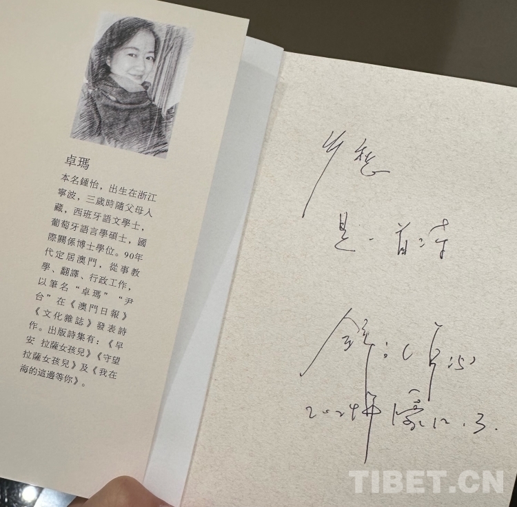 用餐結束后,卓瑪姐送我們每人一本她最新創(chuàng)作的詩集《昨天和明天都會回來》,并在扉頁親手寫上寄語,每人的寄語都不同。她在贈予帕洛扎的書上寫著“鄉(xiāng)愁,是一首詩”,給我寫著“走著走著別把自己走丟了”,給浩然寫著“別輕視 弱小的溫柔”……每條寄語,都寄托著卓瑪姐他鄉(xiāng)遇故知的溫暖與感動。對于西藏,我想卓瑪姐與帕洛扎一樣,都已經(jīng)把它當成了自己深愛的故鄉(xiāng)。西藏承載著她兒時的記憶,小時候居住過的水泥廠、上學時走過的路、拉中的老師同學……那些或欣喜或難忘的往事,都是她與西藏這片土地最真實的情感連接,這種情懷,無法割舍,更不能割舍。(中國西藏網(wǎng) 記者/呂靜 易文文 姚浩然 王東)