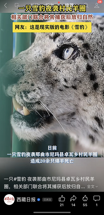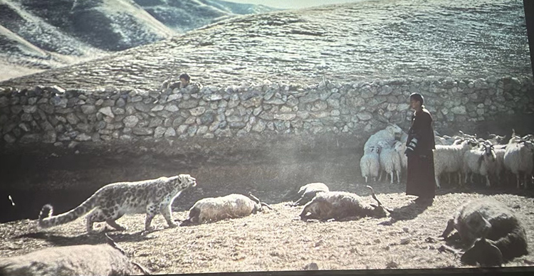 影片的結(jié)尾似乎很突然,雪豹終究沒有死在受損牧人暴怒的情緒和揮舞的錘子下,在人類文明的關照下,被主動解圍,回歸雪山,與小雪豹相會相伴。只有萬導這種深邃包容、沉著冷靜又充滿睿智的作家、藝術(shù)家才能挖掘和表現(xiàn),這里蘊含著生命的慈悲和世人的智慧。對此,我們還有哪些拷問呢?
