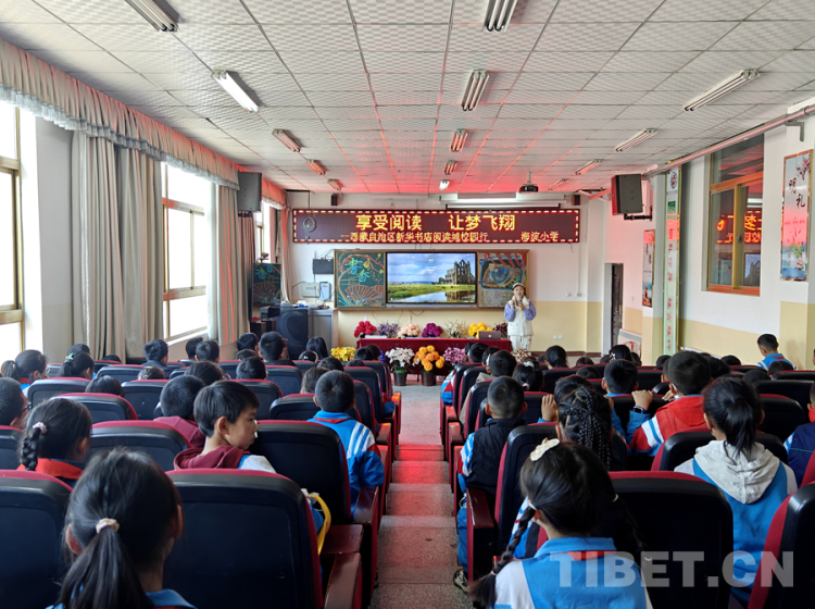 圖為4月23日,西藏自治區(qū)新華書店在拉薩市城關區(qū)海淀小學開展的“享受閱讀讓夢飛翔”閱讀校園行活動現(xiàn)場?;顒友埩俗骷依钗粝驅W生們分享人與動物、人與自然的故事 攝影:次旦拉姆