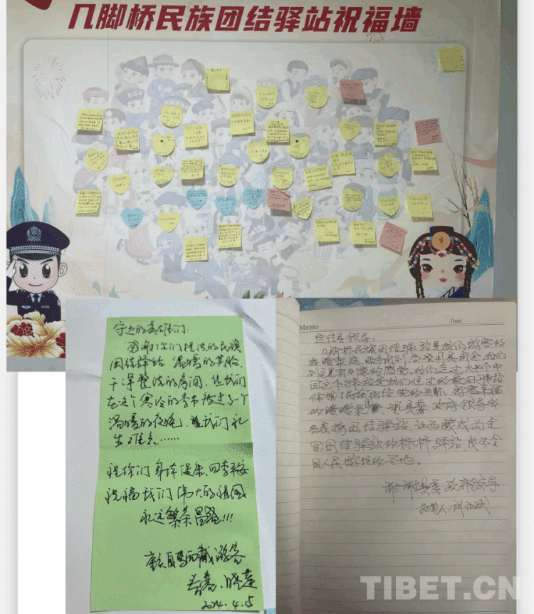 記者在社交媒體上也看到了很多游客以視頻、圖文等形式分享了他們和幾腳橋民族團(tuán)結(jié)驛站的故事。“因?yàn)楫?dāng)?shù)靥厥庠蛭覀兊娇h城沒(méi)有地住了,在小紅書(shū)上看到這個(gè)驛站可以留宿,實(shí)在沒(méi)有辦法去邊防檢查站詢問(wèn)。邊防小哥哥了解原因后特別暖心立馬給我們安排住宿,洗漱用品樣樣不差,太贊啦!這是我這一路旅行睡得最香的一晚,主要還免費(fèi)!”一位游客半調(diào)侃地分享了自己的故事,還加了三張夜拍驛站的圖片。一張用外景,在夜里,“幾腳橋民族團(tuán)結(jié)驛站”漢藏雙語(yǔ)大牌十分醒目;一張室內(nèi)環(huán)境,左右兩邊的上下鋪床上放著四個(gè)“豆腐塊”被子,床單潔白如新,中間的小桌子上還放著氧氣罐、雜志、臺(tái)燈等用品;一張貼滿祝福與感謝的“便簽墻”……張張圖片體現(xiàn)了驛站工作人員的用心良苦,也定格著他難忘的定結(jié)記憶。