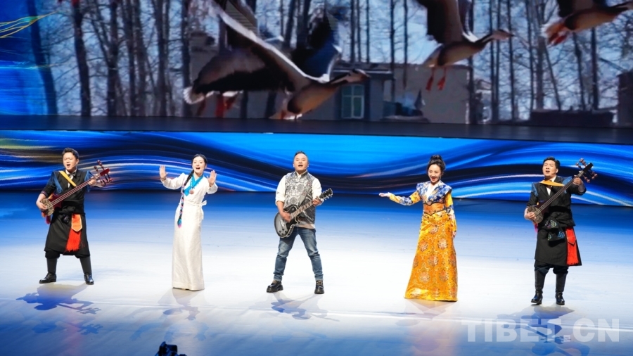 專題演出由開場《祖國萬歲》、上篇《尋夢天湖》、下篇《歡歌拉薩》、尾聲《扎西德勒》四個部分構(gòu)成。通過充分挖掘拉薩的民俗風情,將藏族歌舞、傳統(tǒng)說唱藝術等元素巧妙地融入其中,用視頻展示的自然風光、人文景觀作為輔助,優(yōu)化舞臺布局設計,巧妙布景,為觀眾營造一種身臨其境的感受,共同創(chuàng)造出一個充滿歡樂與感動的氛圍,力圖讓更多的人了解拉薩、愛上拉薩,感受這座城市的獨特魅力和文化內(nèi)涵。此外,還邀請了容中爾甲、四郎貢布、次仁桑珠、益西卓瑪?shù)妊菟嚱缛耸抗嬷囇莩?,進一步豐富和活躍專題演出氛圍。