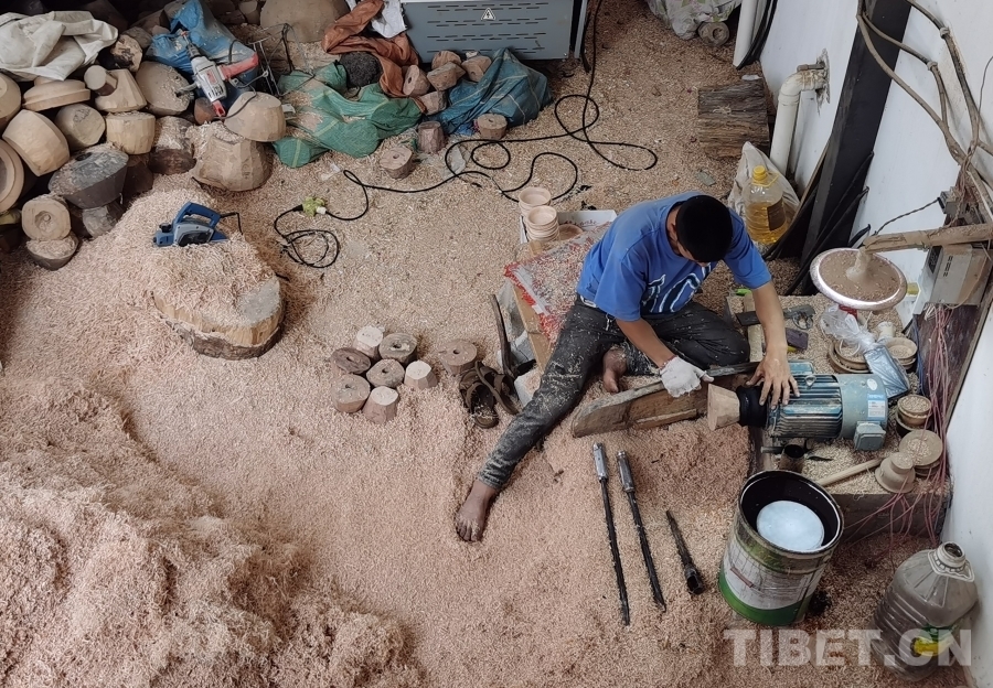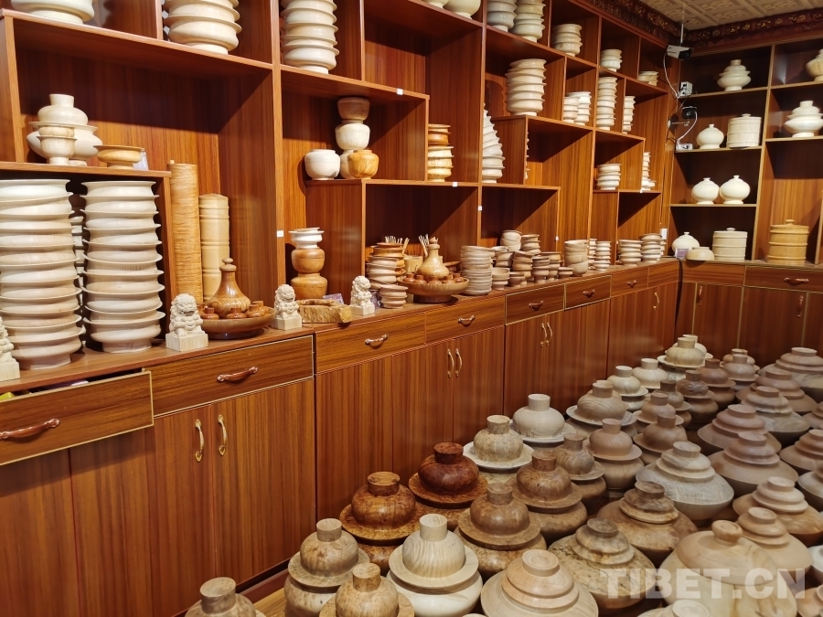 我們首先來到的是四川省非物質文化遺產(chǎn)項目——藏族民間車模技藝體驗基地。基地一層是工作區(qū),一位師傅正在全身心制作木質生活用具,絲毫沒有察覺我們的到來。于是沒有過多打擾,我們徑直來到二樓展品陳列區(qū)。藏族民間車模技藝傳承人格絨次仁的兒子洛絨次仁拿起一個木碗,臉上露出樸實而靦腆的微笑介紹道,“這些都是選用樹瘤制作而成,一般選用鵝掌木、杜鵑等15類樹木,因為直木容易裂開。為了用具不裂開,處理后的樹瘤煮水后需晾干五至六個月,一個木碗制作工序可能要長達半年才能完成。此項技藝在家族傳承至今已有四代,我們要做就做好一點?!甭褰q次仁大哥希望更多人能了解這項非物質文化遺產(chǎn),有更多人愿意來傳承學習這份技藝,有更多人喜歡他們制作的這些木質生活用具。