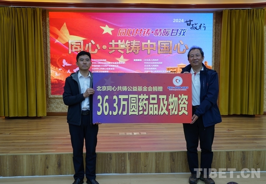 會議開始,與會人員一同觀看了“同心共鑄·情暖甘孜——‘同心·共鑄中國心’2024甘孜行”活動直播。隨后,白玉縣委書記劉堰,專家團團長、清華長庚醫(yī)院神經(jīng)外科主任醫(yī)師王貴懷分別致辭?,F(xiàn)場還舉行了捐贈儀式和授旗儀式。