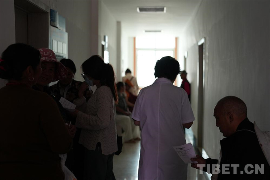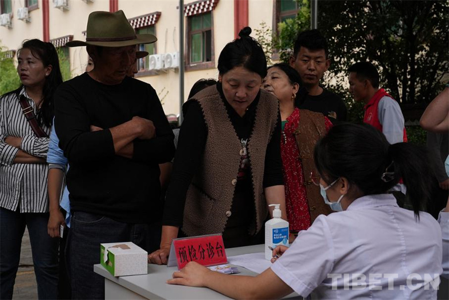 圖為巴塘縣群眾在預(yù)檢分診臺排隊領(lǐng)取病科條 攝影:姚浩然