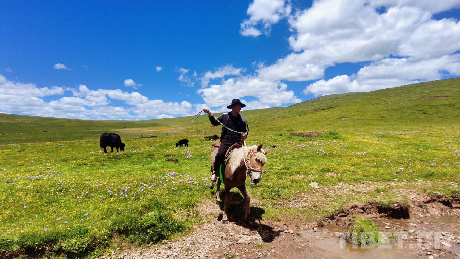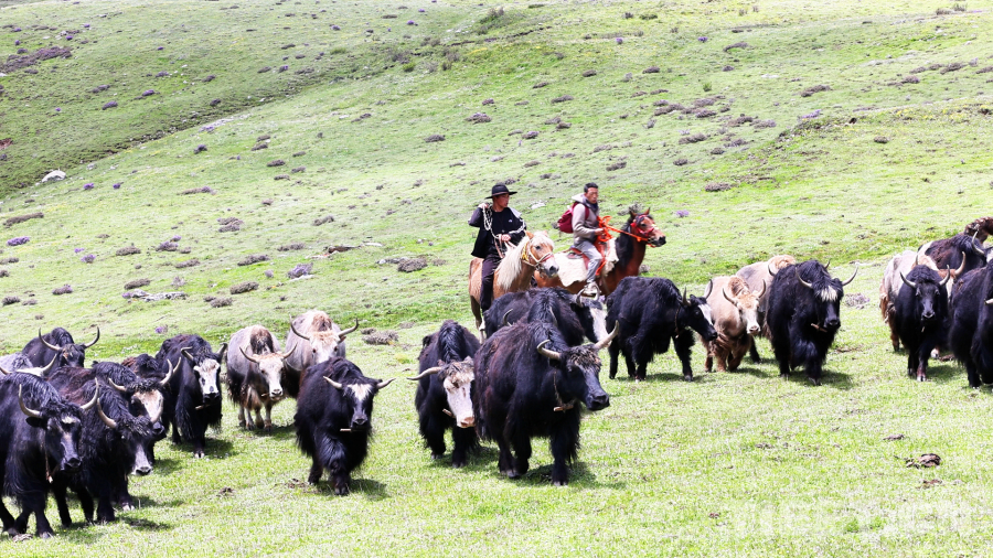 昌臺草原的7月,進入夏季,白玉縣阿察鎮(zhèn)阿察村的牧民們便開始轉移牧場,從冬季牧場日通草原轉移到夏季牧場石門科草原,每一次轉場都是一次大遷徙,氣勢磅礴壯觀。四郎彭措一家也開始了今年的轉場工作,沿著冬季牧場到夏季牧場的牧道,四郎彭措和表弟仁真巴登兩位牧人騎著兩匹駿馬,趕著一群牦牛有序地進行著轉場。