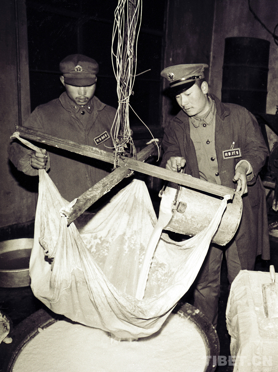 五道梁兵站戰(zhàn)士正在制作豆腐。在風(fēng)雪青藏公路線上,它豐富了過往人員就餐的“菜盤子”(唐召明1987年攝)