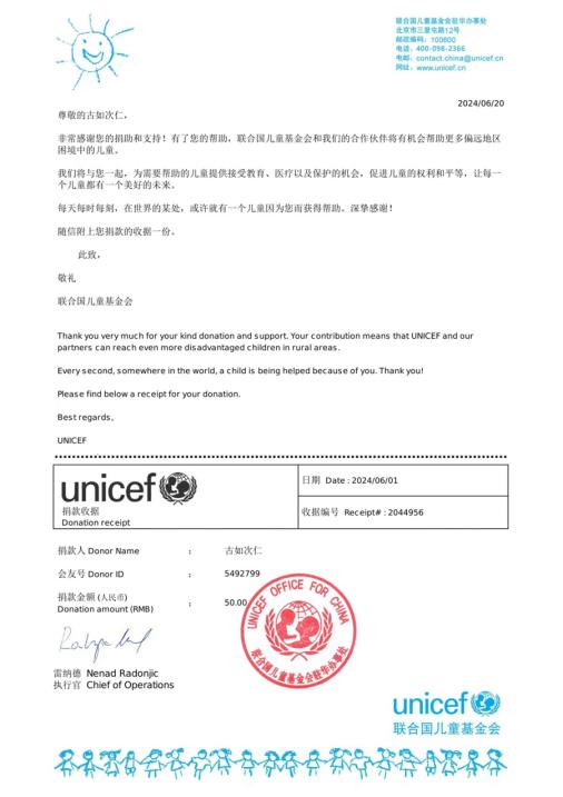 “之后的每個(gè)月我都會(huì)把省吃儉用節(jié)約下來的錢捐贈(zèng)給聯(lián)合國兒童基金會(huì),雖然每月捐贈(zèng)的金額數(shù)不大,但我這幾年一直力所能及地堅(jiān)持做著這件事?!惫湃绱稳收f,到大學(xué)后每月還有勤工儉學(xué)的收入,所以我會(huì)繼續(xù)堅(jiān)持做這件事,能通過自己的方式幫助到貧困兒童非常有意義。