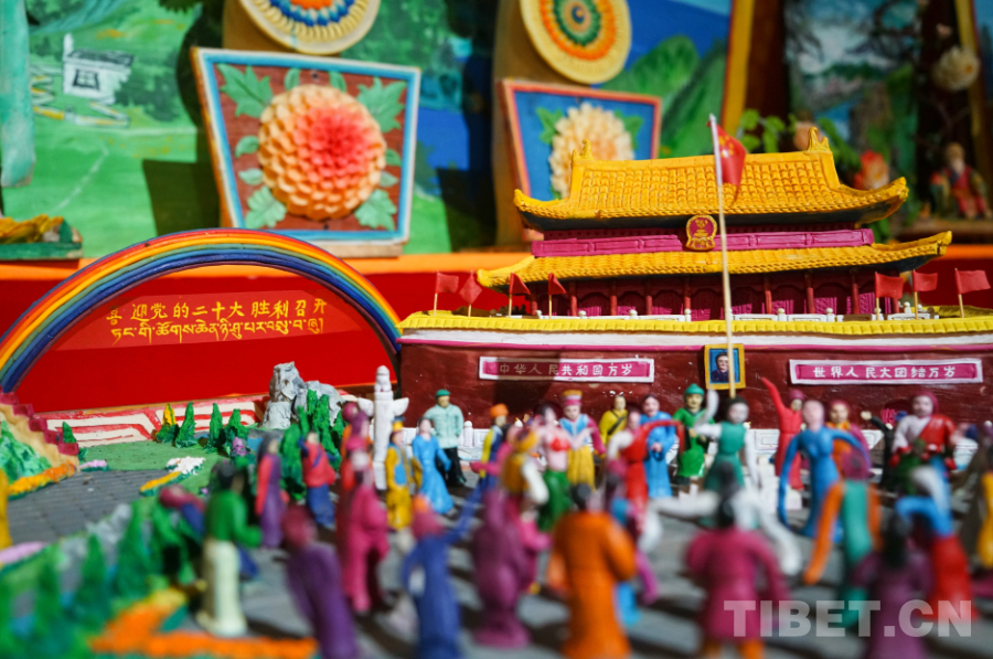 瓊科寺酥油花2018年被列入西藏自治區(qū)第五批自治區(qū)級非物質(zhì)文化遺產(chǎn)代表性項目?!斑@個展廳里最大的一幅作品,是我們寺院內(nèi)20多名僧人花10天時間制作完成的。我們寺院每年都會有符合時代旋律的新時代題材作品創(chuàng)作產(chǎn)生,我希望通過我們一年一年、一點(diǎn)一滴的努力,能夠終有一日將酥油花申報為國家級非物質(zhì)文化遺產(chǎn)代表性項目。”瓊科寺酥油花非遺傳承人阿旺西尼說。