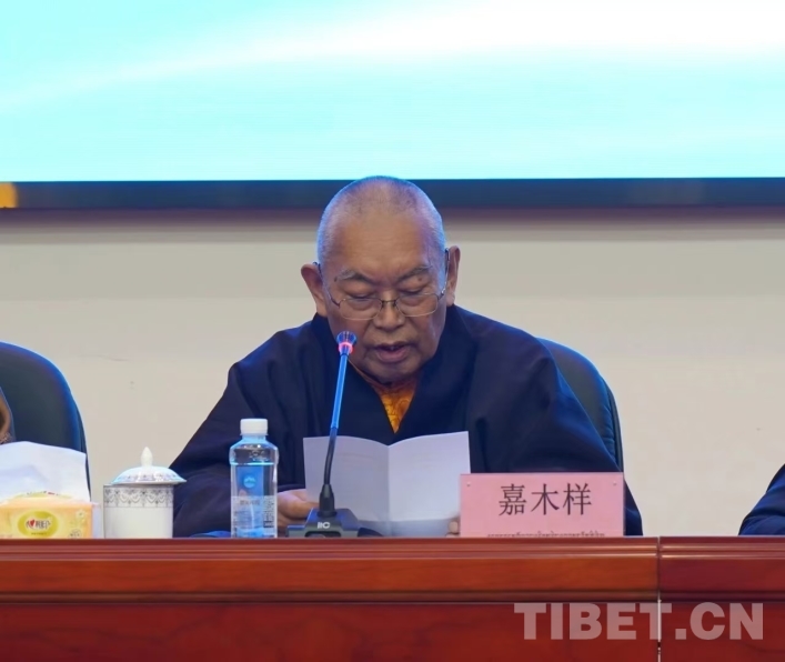 圖為中國(guó)藏語系高級(jí)佛學(xué)院院長(zhǎng)嘉木樣致辭。章淑貞 攝