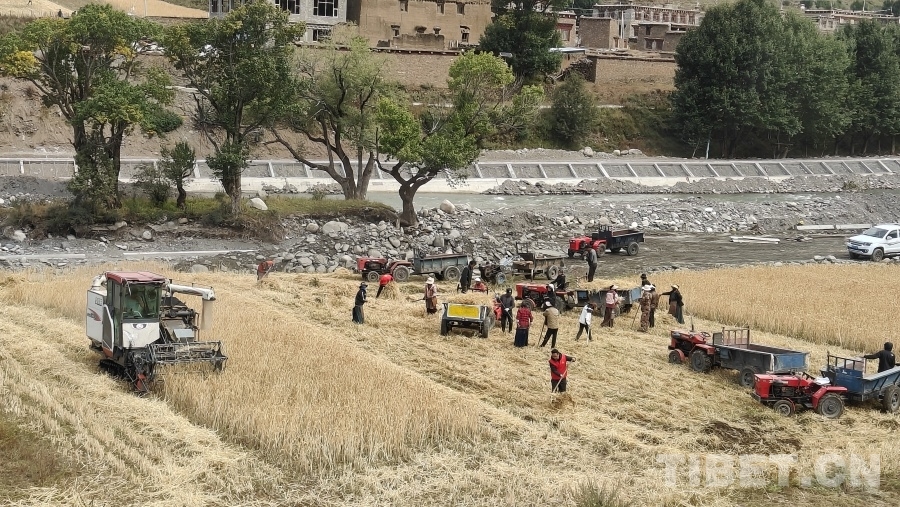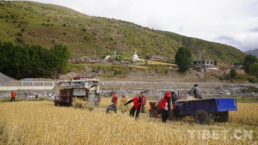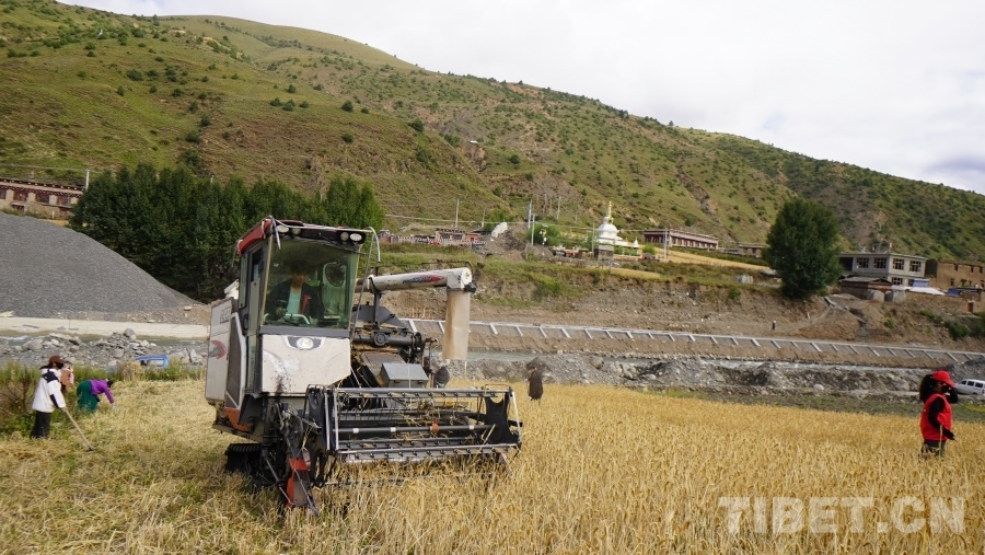 中國(guó)西藏網(wǎng)訊 眼下正是地處川西高原的四川省甘孜藏族自治州理塘縣青稞成熟時(shí)節(jié),群眾們忙著用收割機(jī)收獲青稞,在中秋時(shí)節(jié)感受豐收的喜悅。