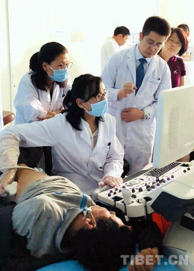 圖為夏宇(左三)援藏期間,在西藏自治區(qū)人民醫(yī)院超聲醫(yī)學科指導當地醫(yī)生做超聲檢查工作(夏宇提供圖片)