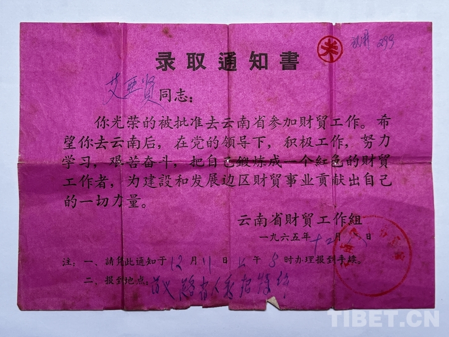 圖為1965年,云南省財(cái)貿(mào)工作組為訪談對象艾亞賢發(fā)的錄取通知書 供圖:李志農(nóng)