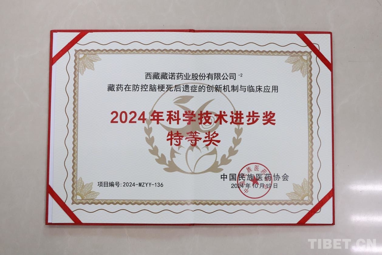 經(jīng)過申報(bào)、內(nèi)審和組織有院士、國醫(yī)大師等各民族專家組成的專家委員會(huì)初評、終評、公示、報(bào)備等環(huán)節(jié)和程序,由河北醫(yī)科大學(xué)第二醫(yī)院、西藏藏諾藥業(yè)股份有限公司、石家莊藏諾藥業(yè)股份有限公司聯(lián)合申報(bào)的《藏藥在防控腦梗死后遺癥的創(chuàng)新機(jī)制與臨床應(yīng)用》被授予“2024年中國民族醫(yī)藥協(xié)會(huì)科學(xué)技術(shù)進(jìn)步獎(jiǎng)”特等獎(jiǎng)。