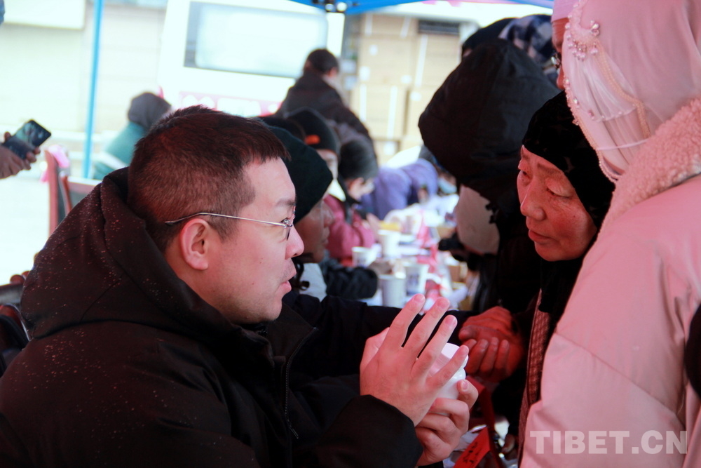 在郎木寺義診點,此前為了容納更多群眾就診,因此將義診點設在了寺院門外的小廣場。盡管大雪紛飛,但提前得知義診消息的群眾已經(jīng)陸續(xù)趕來,擔心臨時更換義診場所影響后續(xù)前來的群眾就診,醫(yī)務志愿者們毫無怨言地在臨時搭起的防雨棚下按時開始了義診。