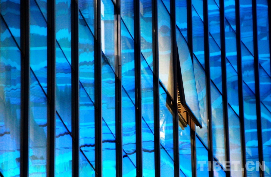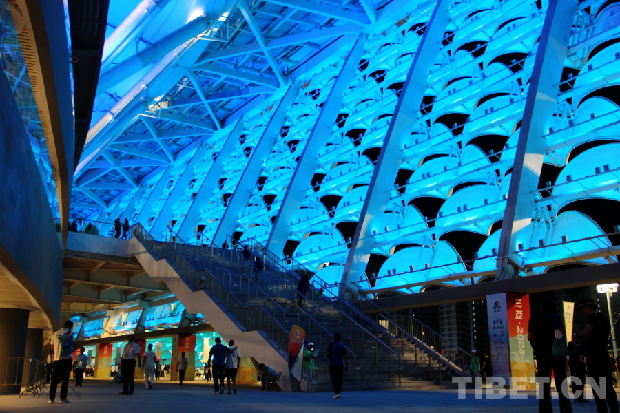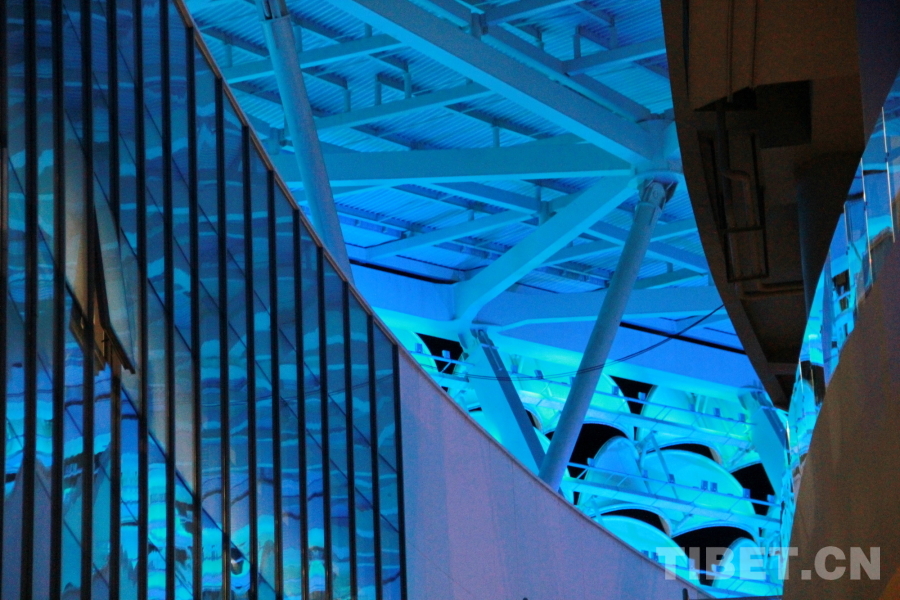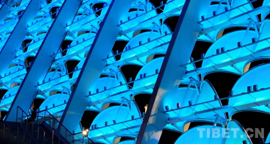 圖為三亞市體育中心體育場內部的玻璃結構反射的藍色燈光 攝影:劉莉