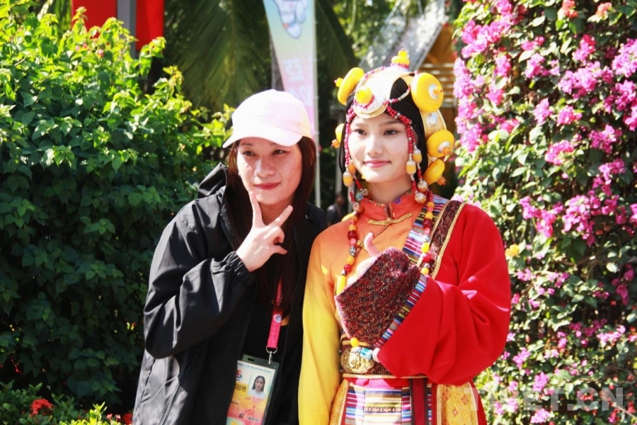 圖為第十二屆全國少數(shù)民族傳統(tǒng)體育運動會民族大聯(lián)歡活動現(xiàn)場,來賓與身著藏族服飾的演員合影 攝影:劉莉