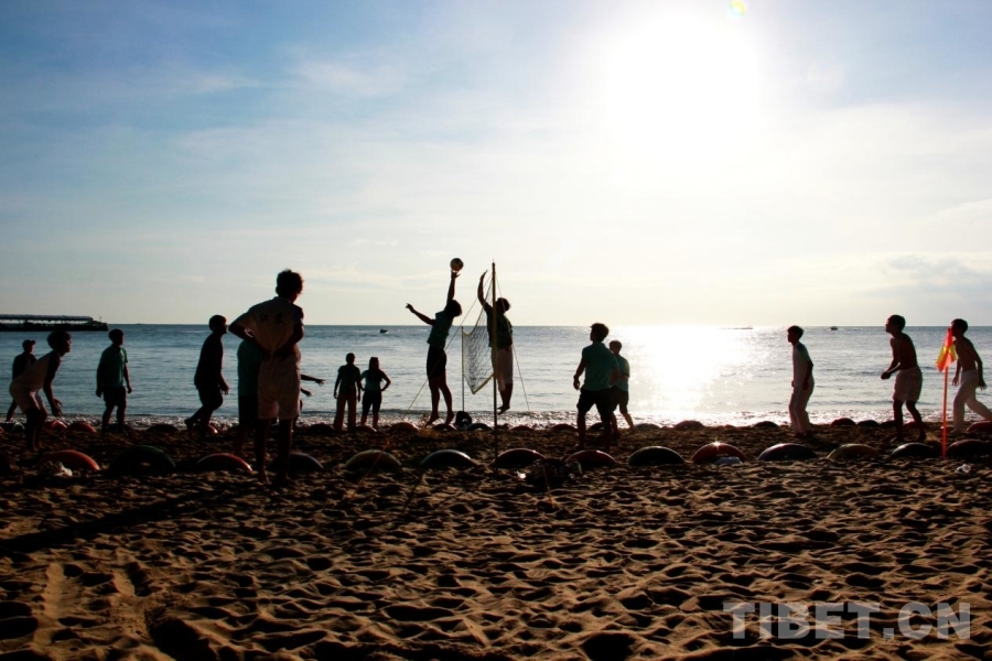 圖為第十二屆全國少數(shù)民族傳統(tǒng)體育運動會民族大聯(lián)歡活動現(xiàn)場,各代表團運動員們感受沙灘排球 攝影:劉莉