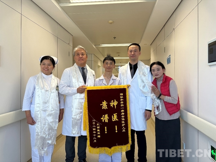 圖為扎西和母親向協和醫(yī)院骨科醫(yī)療團隊贈送錦旗 攝影:楊眉笑