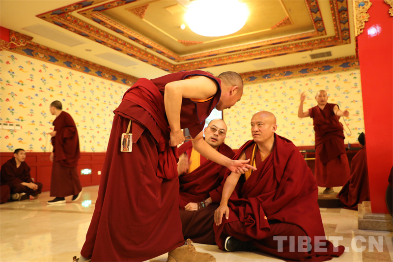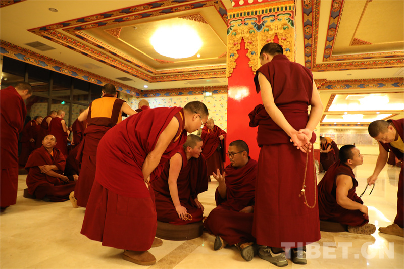 下午,師生們旁聽了中國特色社會(huì)主義理論和憲法與法律基礎(chǔ)等課程。晚上,開展了精彩非凡的辯經(jīng)活動(dòng)。學(xué)員們各自組團(tuán)尋找“對(duì)手”,大廳里激烈的辯論聲、擊掌聲此起彼伏,場面熱烈,氣勢逼人。辯經(jīng)是藏傳佛教中一種獨(dú)特的學(xué)習(xí)方式,通過對(duì)辯雙方邏輯清晰、言之有據(jù)的反復(fù)辯論,加深學(xué)習(xí)理解。