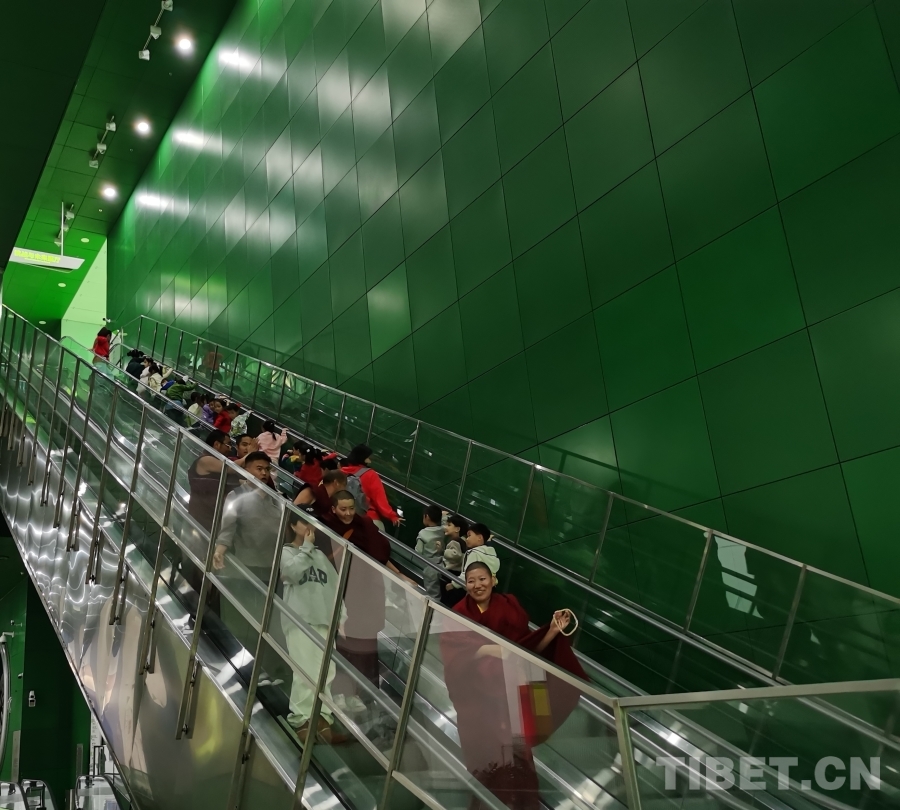 圖為西藏佛學(xué)院師生與科技館里的孩子們在扶梯上互相揮手示意