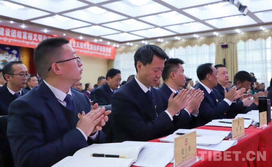 拉薩市政協(xié)主席江擁洛追代表政協(xié)第十二屆拉薩市委員會常務委員會向大會作工作報告。