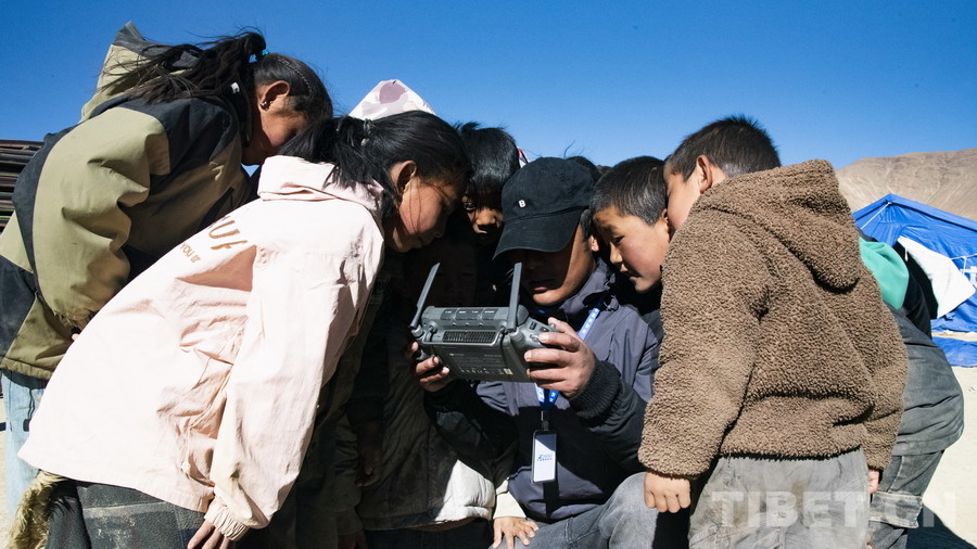 圖為在左措村受災(zāi)群眾安置點(diǎn),小朋友們圍觀無(wú)人機(jī)空中視角 攝影:趙振宇