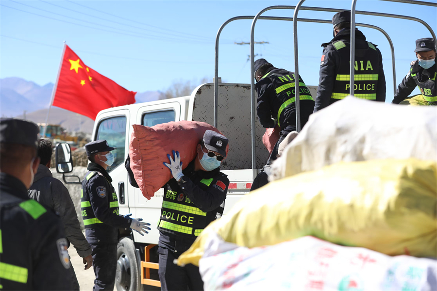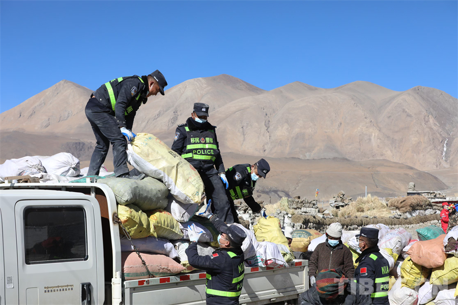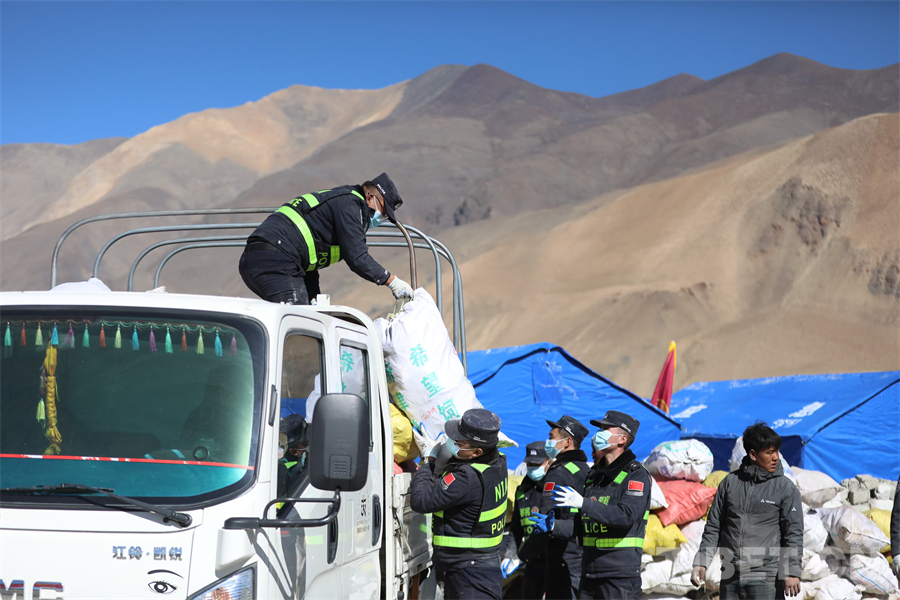 圖為西藏移民管理警察在定日縣長所鄉(xiāng)雜村為受災群眾轉(zhuǎn)移物資 攝影:郭遠敬