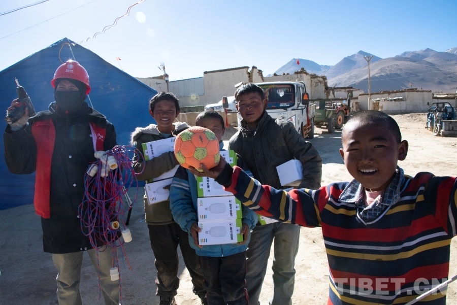 “來,你們拿著這些燈泡跟著我!”在次仁旦增和其他兩位組員的組織下,小男孩們化身為措昂村受災(zāi)安置點的小小志愿者,簇?fù)碇鴱倪@些從山南前來支援的國家電網(wǎng)工作人員走進(jìn)一間間帳篷,為站在高處正在架設(shè)電線的叔叔們遞上工具和燈泡。