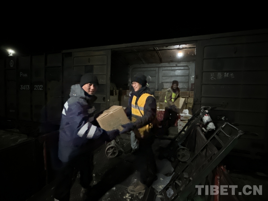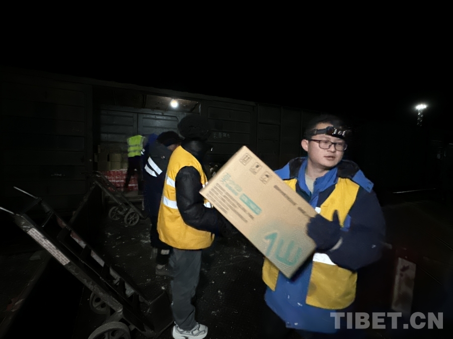 圖為首趟抗震救災(zāi)物資專列抵達(dá)日喀則,工作人員爭分奪秒進(jìn)行物資搶卸轉(zhuǎn)運(yùn) 攝影:周悅翔 馬生明