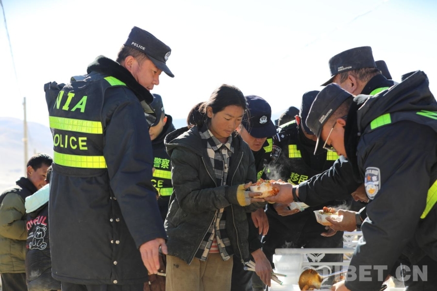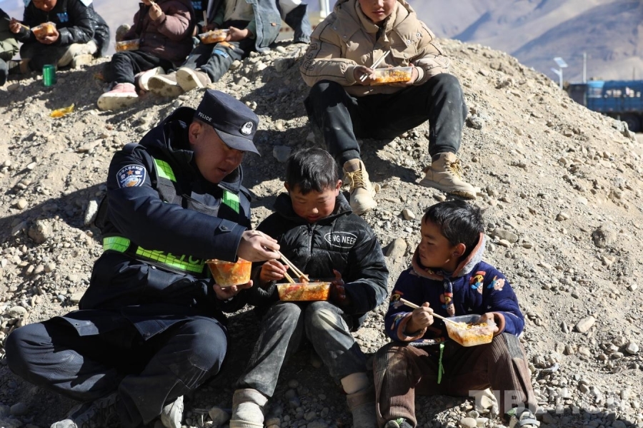 圖為在日喀則市定日縣長(zhǎng)所鄉(xiāng)雜村安置點(diǎn),移民管理警察為小朋友和群眾提供午餐 攝影:郭遠(yuǎn)敬