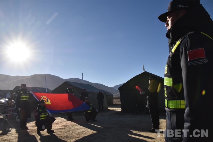 圖為中國(guó)人民警察節(jié)當(dāng)天,在日喀則市定日縣長(zhǎng)所鄉(xiāng)雜村安置點(diǎn),日喀則邊境管理支隊(duì)支隊(duì)長(zhǎng)馬自防帶領(lǐng)安置點(diǎn)參與抗震救災(zāi)民警向警旗宣誓 攝影:崔娜