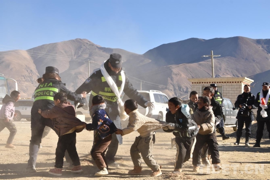 圖為在日喀則市定日縣長(zhǎng)所鄉(xiāng)雜村安置點(diǎn),移民管理警察和小朋友玩老鷹捉小雞游戲 攝影:卿光強(qiáng)