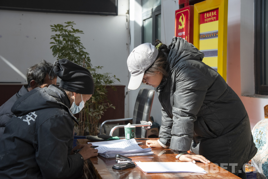 圖為嘎白村村干部塔杰(左)、頓珠巴姆(中)、阿旺德金(右)正在村委會統(tǒng)計相關安置數(shù)據(jù) 攝影:趙振宇