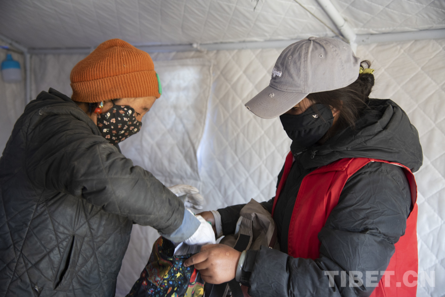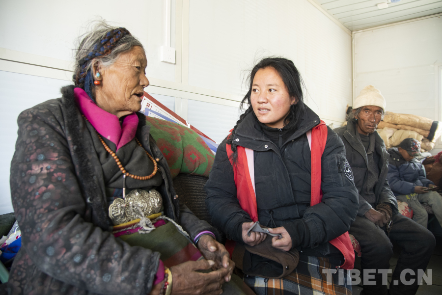 圖為次仁玉珍(左二)正在安置點內(nèi)了解受災群眾情況 攝影:趙振宇