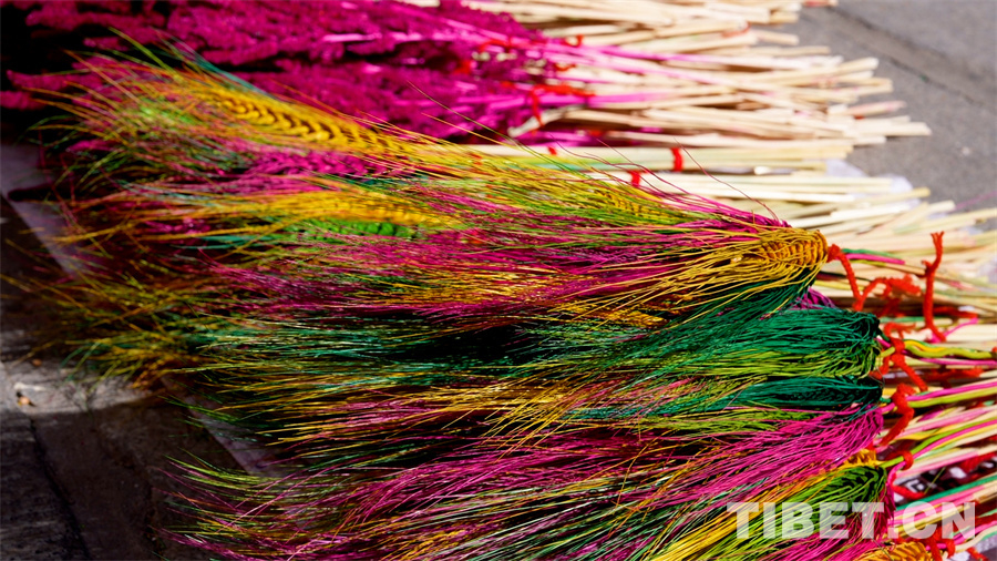 在藏歷新年年貨物品中,提及酥油花就不得不提它的“搭檔”“羅薩梅朵”,正是因?yàn)樗鼈兊难b點(diǎn)讓藏歷新年中本身就已很精致的“切瑪盒”更加亮眼。“羅薩梅朵”被稱為“冬季里最美麗的花”,是經(jīng)過染色的麥穗和青稞穗制作成的“花卉”。在藏歷新年或節(jié)日之時(shí),人們將其插在盛滿糌粑和青稞的“切瑪盒”上,寓意新的一年美滿、豐收。