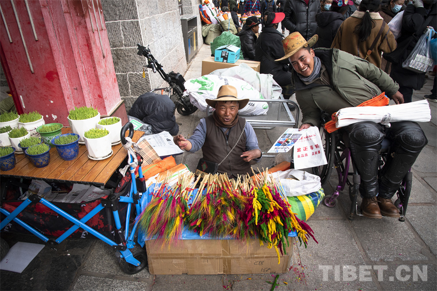 普瓊,來自日喀則市江孜縣,在八廓商城南門前經(jīng)營著自己的“羅薩梅朵”小攤。初見普瓊,我們被他沖著鏡頭的燦爛笑容所吸引。細(xì)細(xì)觀察,普瓊坐在地上的身高卻比別人矮了一大截?!拔覀儚睦_堆龍德慶的批發(fā)市場(chǎng)上買來這批‘羅薩梅朵’在此銷售,就希望能夠在年前的這段時(shí)間多賺些小錢補(bǔ)貼家用,所有人都想在新年之時(shí)過個(gè)充裕的‘好年’,不是嗎?”普瓊因一次意外高位截癱,失去雙腿的他并沒有消沉。他選擇積極面對(duì)生活,用自己的雙手和命運(yùn)抗?fàn)?,用?jiān)強(qiáng)和勤勞讓自己和全家過上更好的生活。與普瓊不幸的經(jīng)歷相比,我們每個(gè)人過的每個(gè)年何嘗不都是一個(gè)個(gè)“好年”呢?普瓊對(duì)生活的那種熱愛,對(duì)明天會(huì)更好的堅(jiān)定,何嘗不是我們對(duì)每一個(gè)“好年”所孜孜追求的呢?