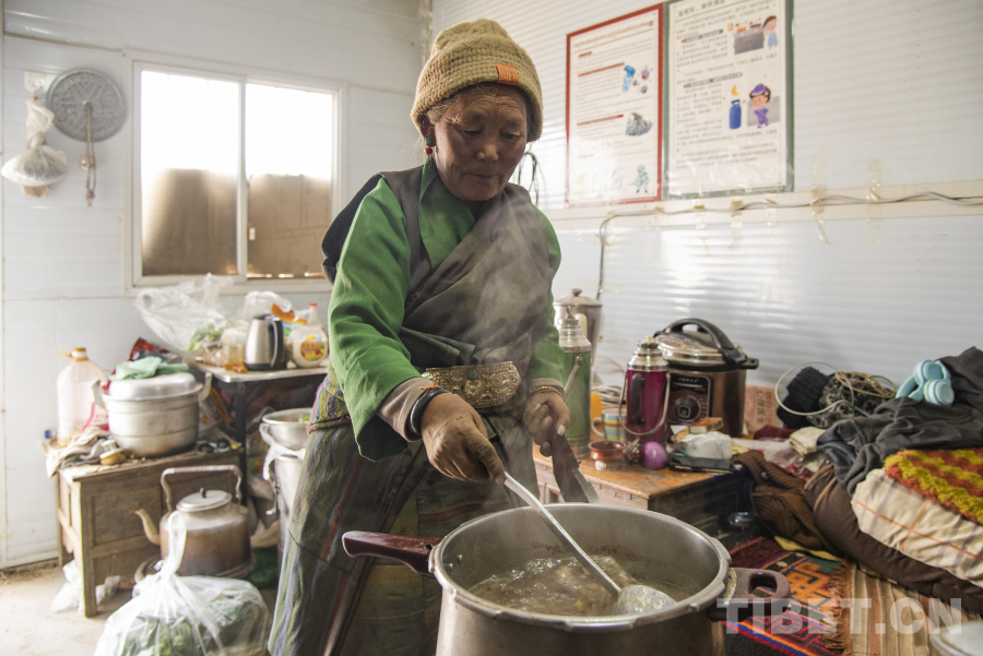 圖為曲珍老人正在安置板房內(nèi)準備“古突” 攝影:趙振宇
