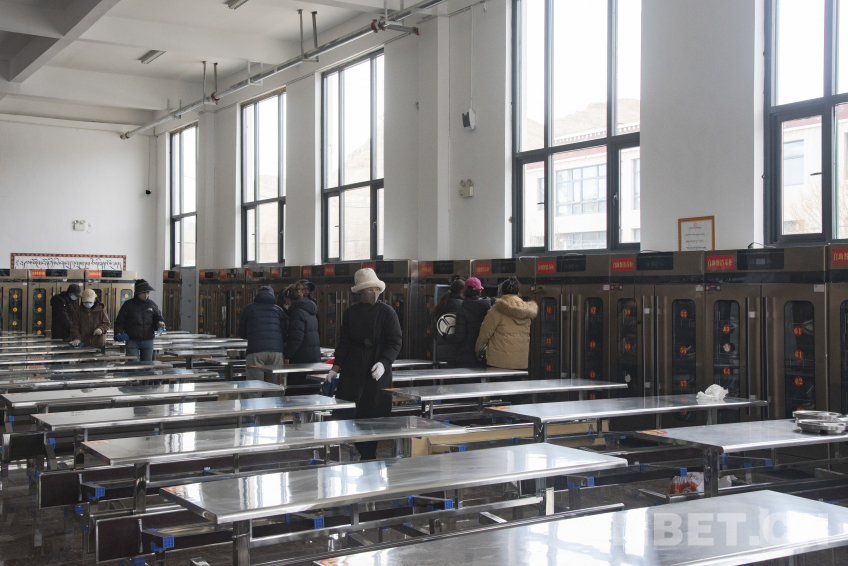 圖為長所鄉(xiāng)完全小學(xué)集中安置辦學(xué)點內(nèi)新規(guī)劃的學(xué)生食堂,教職工們正在清理食堂衛(wèi)生?!z影:趙振宇