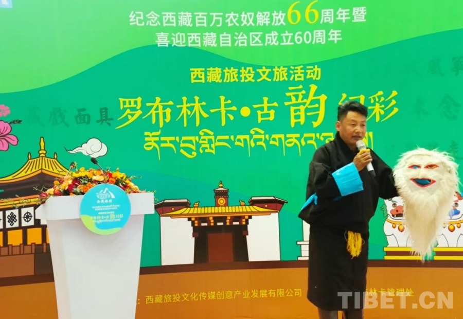 圖為3月30日在拉薩羅布林卡舉辦的“羅布林卡·古韻幻彩”活動中,藏戲傳承者講述藏戲面具的故事 攝影:趙釗
