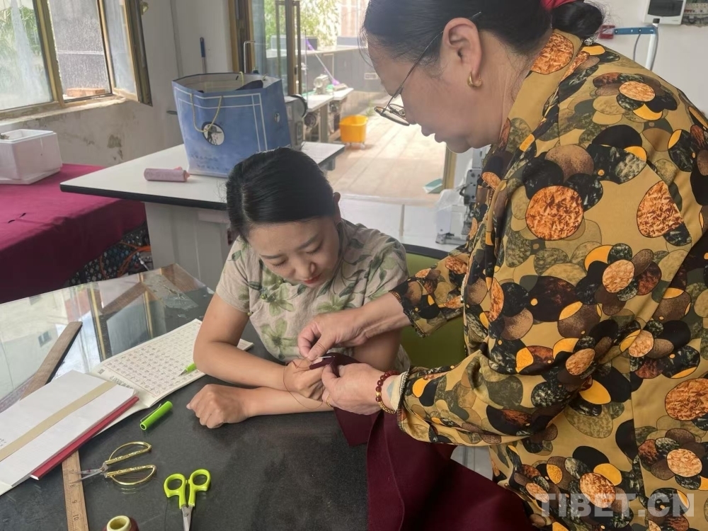在位于青海省海南藏族自治州共和縣的青海阿姐珠姆文化旅游產(chǎn)業(yè)有限公司里,總經(jīng)理仁青卓瑪正在和她的員工們一起看藏族服飾設(shè)計(jì)圖稿、選擇服裝面料。一旁一位員工踩著縫紉機(jī)縫制布料,在此起彼伏的縫制聲中,一塊塊色彩斑斕的布料被拼接成型。