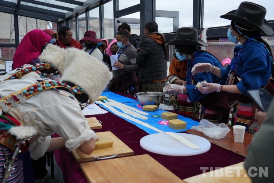 圖為“拉拉”和“推”制作現(xiàn)場?!袄焙汀巴啤笔遣乇豹毦咛厣囊环N高品質(zhì)乳制品,它可以給牧民提供極高的營養(yǎng),是招待客人和饋贈親朋好友的食物之一。